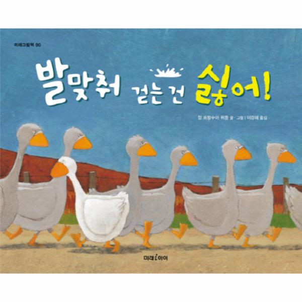 - 하나 둘! 하나 둘! 하나 둘! 오늘도 거위들은 이고르 대장의 구령에 맞춰 착착 행진해요. 왜 그래야 하는지는 아무도 모릅니다. 오랫동안 그래왔거든요. 하지만 새로 온 꼬마 거위, 지타는 발맞춰 걷는 게 무척 힘이 듭니다. 그렇게 걷는 게 익숙지도 않고, 왜 그렇게 걸어야 하는지도 모르겠고요. 결국 지타는 무리에서 쫓겨나고 맙니다. 무리에서 벗어난 지타는 홀로 연못가로 내려갑니다. 지타나 내는 철퍽대는 발걸음과 훌쩍대는 소리에 농장의 다른 동물들이 재미있는 소리를 내며 끼어듭니다. 그리고 온갖 동물들의 소리와 저마다의 발걸음이 합쳐져 정말 재미있고 신나는 음악이 만들어지고, 그 음악에 맞춰 모두들 신나는 행진을 벌입니다. (미래그림책90『발맞춰 걷는 건 싫어!』는 남과 다른 자신의 모습을 그대로 받아들이고 그것을 계발하는 데서 전체적인 조화도 얻을 수 있음을 아름다운 일러스트와 재미있는 동물 소리로 들려주는 그림책입니다.
