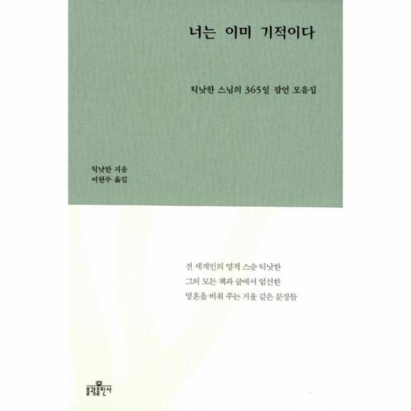 《너는 이미 기적이다》는 세계에서 가장 존경받는 영적 스승이자 베스트셀러 작가이자 평화운동가인 틱낫한 스님 책이다. 스님의 모든 책과 글에서 우리 영혼을 비춰 주는 거울 같은 문장 365개를 엄선해서 우리에게 건네는 선물이다.