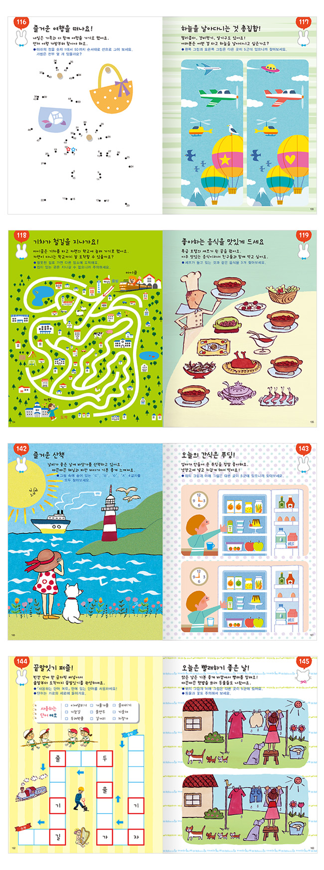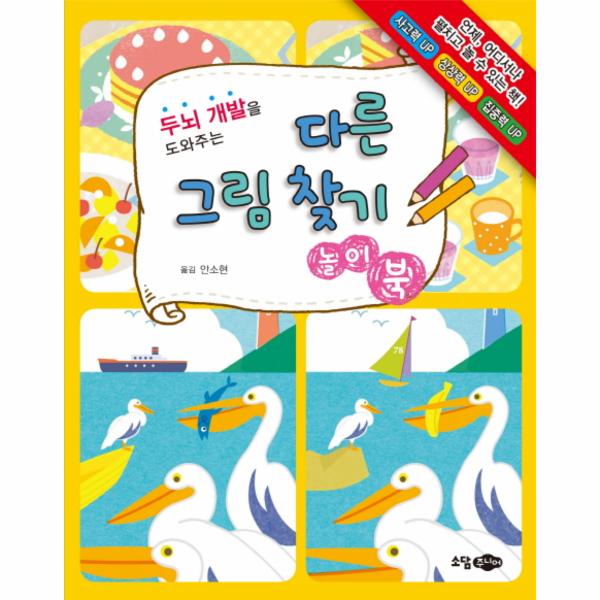 미디어에 24시간 노출된 아이들에게 매일 독서 처방을 내리기란 쉽지 않습니다. 독서의 장점은 셀 수 없이 많지만 독서 습관 역시 하루아침에 만들어지는 것은 아니니까요. 책을 멀리하게 되는 이유가 지루하고 재미없기 때문이라면 게임처럼 하나씩 성공시켜 한 장씩 페이지를 넘기는 책이라면 어떨까요? 《다른 그림 찾기 놀이북》은 미로 찾기, 그림 찾기 퀴즈, 색칠하기, 퍼즐 등 흥미로운 퀴즈가 무려 160개나 수록되어 있는 활동북이랍니다. 게다가 어렵거나 복잡하지 않아서 아이 혼자서도 자신감을 갖고 즐겁게 풀 수 있습니다.