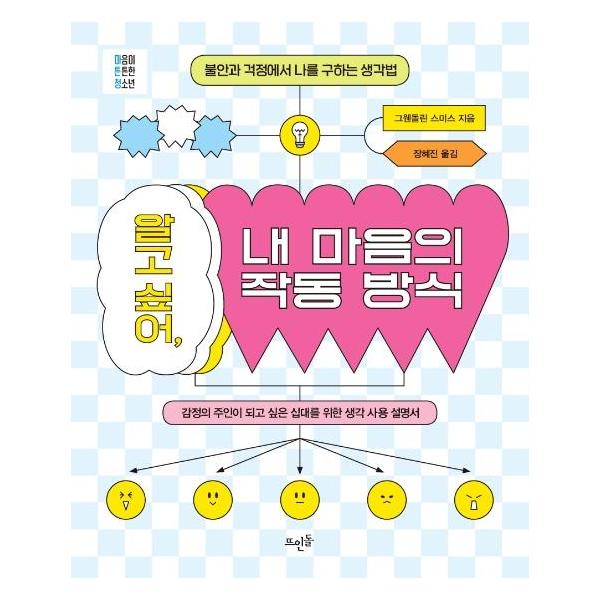 청소년 전문 임상심리학자이자 『알고 싶어, 내 마음의 작동 방식』의 저자 그웬돌린 스미스는 ‘자신의 마음이 움직이는 방식을 이해하는 방법’을 제시한다. 그는 인지행동치료법을 근거로 우리의 마음을 작동하고 움직이는 것은 ‘생각’이며, 부정적인 감정이 마음을 지배하는 이유는 세상을 받아들이는 생각이 왜곡되어 감정이 과장되었기 때문이라고 말한다. 즉, 생각을 바꾸면 청소년들이 스스로를 괴롭히는 감정에서도 벗어날 수 있다는 것. 이 책은 청소년들이 감정의 주인으로서 성장할 수 있도록 여러 유형의 왜곡된 생각(비이성적 사고 바이러스들을 설명하고, 이를 물리칠 생각법을 제시한다. 이 생각법으로 자신의 사고방식을 점검하고 머릿속에 새로운 생각의 길을 낸다면 감정의 주인으로서 건강한 마음을 만들어 나갈 수 있을 것이다.