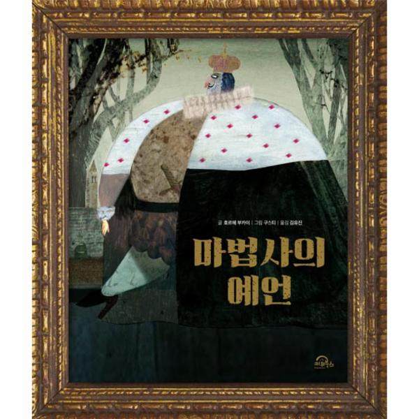 《마법사의 예언》은 강력한 권력을 휘두르는 교만한 왕이 예언 능력을 지닌 마법사를 만나 그의 예언으로 인해 진정한 소통을 배우며 어진 왕으로 변화하는 이야기를 담은 그림책입니다. 독특한 콜라주 기법과 전체적으로 무게감이 느껴지는 어두운 배경에 빨강, 노랑 등의 원색이 가미된 색감은 마치 엄숙하면서도 화려한 왕국에 와 있는 듯한 기분이 들게 합니다. 웅장하고 이국적인 궁전, 화려한 연회장의 어느 벽면을 장식하고 있을 법한 고풍스러운 금빛 액자, 그 안에 근엄한 표정의 왕이 그려진 표지를 넘기면 이 고집스럽게 생긴 왕의 이야기가 시작됩니다.