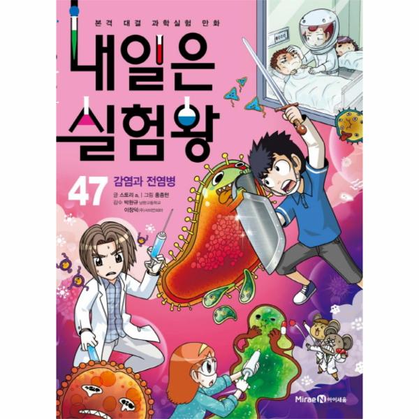 〈내일은 실험왕〉 47권에서는 ‘감염’과 ’전염병’에 관한 과학 정보를 한눈에 보여 주는 실험이 펼쳐집니다. 대결 속 다양하고 재미있는 실험을 통해 감염과 전염병의 정의, 생물속생설, 예방 접종, 병원체와 전염 매개 등에 대해 이해하고 이와 관련된 다양한 과학 정보를 익힐 수 있습니다. 뿐만 아니라 현직 과학 교사와 과학 전문 교육 기관의 세밀한 감수를 바탕으로, 초등학교 5학년 1학기 과학 교과서 5. 다양한 생물과 우리 생활 단원에서 다루고 있는 세균의 정의, 초등학교 5학년 2학기 과학 교과서 1. 생물과 환경 단원에서 다루고 있는 생태계와 환경 등을 통해 교과서 속 핵심 원리를 알기 쉽게 정리하여 학습 효과를 높였습니다. 또한 정보 페이지 ‘집에서 실험하기’에서는 누구나 따라 할 수 있는 간단한 실험을 통해 세제의 역할을 이해하고, ‘세상을 바꾼 과학자’에서는 생물속생설을 증명한 과학자들에 대해 알아봅니다. ‘생활 속의 과학’에서는 여러 가지 전염병을 살펴보고, ‘과학실에서 실험하기’에서는 물방울 현미경 실험을 통해 현미경에 관해 알아봅니다. ‘대결 속 실험하기’에서는 크로마토그래피를 이용하여 색소를 분리하는 방법에 대해 살펴보고, ‘실험왕 핵심 노트’에서는 감염과 전염병에 대한 학습 정보를 요약하여 정리했습니다. 어려운 과학 정보를 이야기로 재미있게 접하고, 정보 페이지에서는 본문에서 접한 개념을 다시 한 번 정리하여 흥미와 학습 모두를 〈내일은 실험왕〉 한 권으로 잡을 수 있을 것입니다.