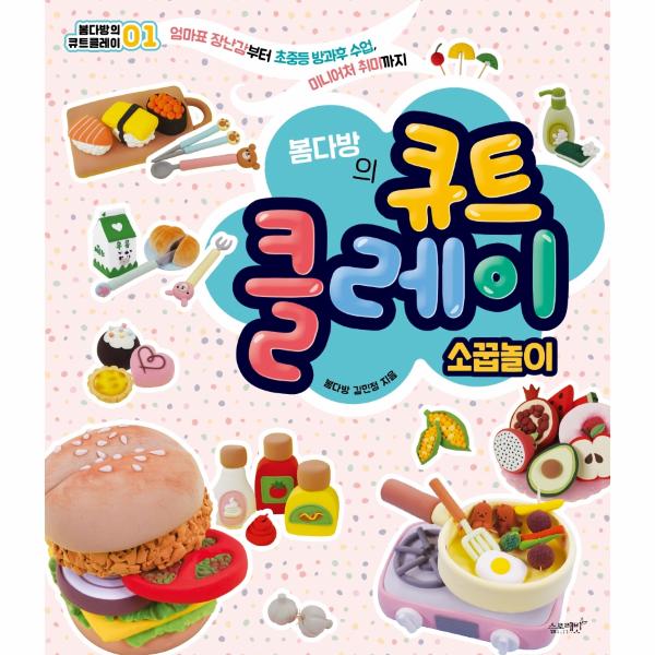 <봄다방의 큐트 클레이 ? 소꿉놀이>는 플라스틱 소꿉놀이 장난감 못지않은 다양한 작품을 수록했어요. ‘Part 1. 주방놀이’에서는 주걱, 국자, 냄비, 프라이팬, 그릇 등 주방에서 쓰는 다양한 도구들을 만들어요. ‘Part 2. 마트놀이’에서는 과일, 채소, 소스류를 만들어요. ‘Part 3. 식당놀이’에서는 우리가 주식과 부식으로 먹는 다양한 요리들을 만들어요. ‘Part 4. 카페놀이’에서는 초콜릿, 케이크와 빵, 음료수 종류를 만들어요. ‘Part 5. 토핑놀이’에서는 자석과 이쑤시개를 이용하여 장난감처럼 토핑을 바꾸며 놀 수 있도록 했어요. 완성된 하나의 햄버거를 만드는 게 아니라, 햄버거빵, 패티, 토마토, 치즈 등 재료마다 자석을 붙여서 내 취향대로 햄버거를 조립하며 노는 식이랍니다.