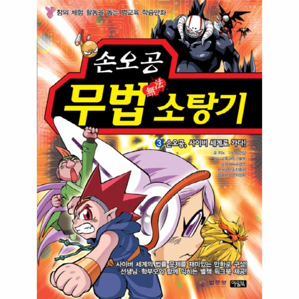 법무부와 함께 하는 손오공의 무법소탕기, 그 세 번째 이야기가 나왔습니다. 손오공은 온갖 범죄를 일으키며 사이버 세계를 지배하려는 위법 대왕의 음모에 맞서 대결을 벌입니다. 이 대결 속에는 게임 중독, 악성 댓글, 해킹, 사이버 스토킹, 아이템 사기, 명예 훼손 등 어린이들의 인터넷 생활에서 흔히 꼭 일어나는 문제들이 다루어집니다. 특히 악성 댓글처럼 장난 삼아 한 행동이 다른 누군가를 향한 범죄 행위가 될 수도 있다는 이야기를 통해, 평소 건강한 인터넷 사용 습관이 얼마나 중요한가를 어린이들에게 일깨워 줍니다.