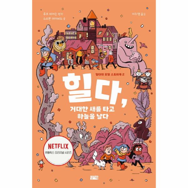 시리즈의 두 번째 이야기인 『힐다, 거대한 새를 타고 하늘을 날다』는 도시에서 새로 사귄 친구들과 함께하는 힐다의 모험을 담고 있습니다. 트롤버그 시 최대의 축제를 앞둔 어느 날, 힐다는 같은 반 친구 프리다, 데이비드와 함께 돌아다니다가 다친 까마귀를 구해 주게 됩니다. 그런데 이 까마귀는 자기 이름도, 하늘을 나는 법도 전부 잊어버렸다고 합니다. 게다가 이 와중에 데이비드는 엘프들에게 인질로 붙잡히고 맙니다. 친구들을 돕기 위해 고군분투하는 힐다. 그사이 마침내 축제 날이 되고, 누구도 예상 못 한 거대한 위험이 다가오는데……. 『힐다, 거대한 새를 타고 하늘을 날다』는 새로운 친구들과의 관계에서 한층 성장해 가는 힐다를 통해 우정의 소중함을 전해 줍니다.