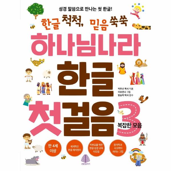 한글은 자음과 모음의 결합으로 이루어진 문자로 세계에서 가장 배우기 쉬운 과학적인 언어예요. 글자와 글자를 퍼즐처럼 조합하는 제자(制字 원리만 정확히 이해하면 마음껏 글자와 낱말을 조합할 수 있지요. 그래서 『하나님 나라 한글 첫걸음』은 한글이 만들어진 원리인 ‘자모음절식’ 학습 그리고 글자와 그림을 연결하고 문장 속 글자를 읽는 ‘낱말·문장식’ 학습, 총 5~6가지 학습 요소를 통해 글자를 확실하게 인지시키도록 구성되었습니다.