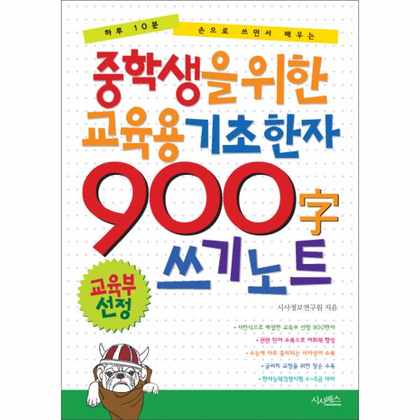 하루 10분 손으로 쓰면서 배우는 중학생을 위한 교육용 기초 한자 900자 쓰기 노트는 교육부에서 선정한 중학교용 기초 한자를 담은 한자책입니다. 중학교에서 사용하는 한자들이지만 초등학생 때 익혀두면 한문을 공부하는 데 많은 도움이 됩니다. 특히 대학입학 시험인 수능에 자주 출제되는 사자성어를 각 페이지 하단에 실었기 때문에 한자를 공부하면서 관련 사자성어도 같이 익히면 일석이조의 효과를 거둘 수 있습니다.