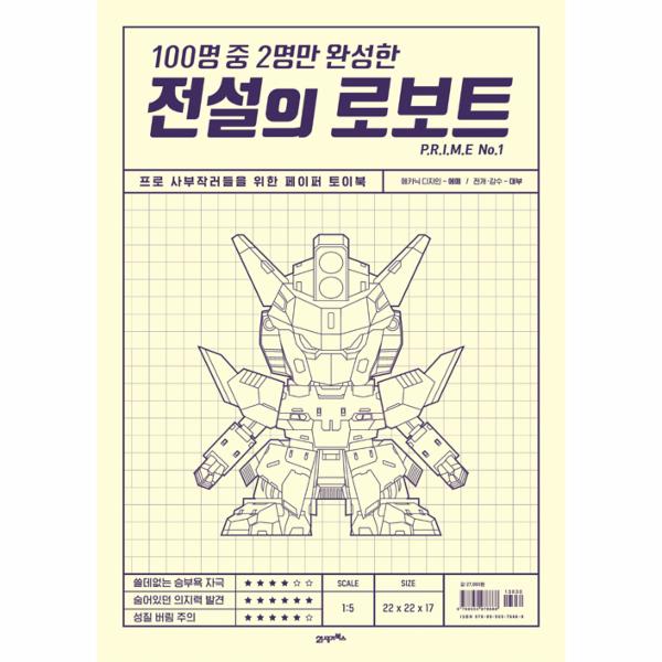 『전설의 로보트 P.R.I.M.E No.1』은 종이 도면을 오리고 접고 붙여 완성하는 페이퍼 토이북 입니다. 그러나 지금까지 봐왔던 페이퍼 토이북과는 전혀 다릅니다. 도면은 머리, 상체, 팔, 다리, 무기, 무장으로 구성되어 있으며, 모두 완성된 로보트는 약 20Cm의 크기를 자랑합니다. 전체적인 완성도를 높여 만드는 즐거움을 느낄 수 있도록 구성했습니다. 때문에 키덜트족, 프로 사부작러들이 혼자 즐기기에 부족함이 없습니다. 더불어 아빠와 아이가 함께 만들거나 온가족이 함께 단합하며 만들어 나가기에도 제격입니다.