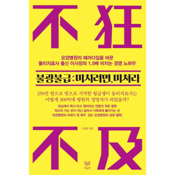 요즘 ‘요양병원’이라고 하면 사람들은 어떤 이미지를 떠올릴까? 아마도 ‘생의 마지막을 보내는 곳’, 좀 더 노골적으로 말하면 ‘죽으러 가는 곳’이라는 인식을 하고 있을지도 모른다. 그런데 경북 안동과 예천에 ‘누워서 입원했다가 걸어서 퇴원하는 병원’을 표방하는 재활요양병원이 있다고 해서 화제다. 복주병원과 경도병원 두 곳은 2016년 ‘소비자의 선택 브랜드 대상’ 시상식에서 의료서비스 부문 대상을 차지한 인덕의료재단에서 운영하고 있는 병원이다. 새로 나온 책 『불광불급 : 미치려면 미쳐라』에는 인덕의료재단 이윤환 이사장의 경영 노하우와 존엄케어 스토리가 담겨 있다.