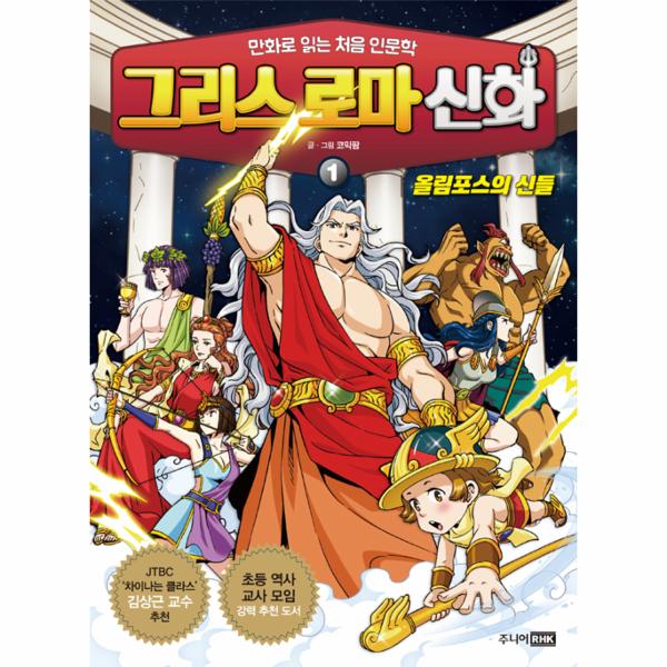 <만화로 읽는 처음 인문학 그리스 로마 신화>는 그리스 로마 신화를 어린이들의 눈높이에 맞추어 재미있는 만화로 구성한 시리즈입니다. 어린이들이 이해하기 쉽도록 ‘올림포스의 신들’, ‘신들의 사랑’, ‘영웅들의 모험’이라는 주제별로 나누어 담았습니다. 각 권마다 아홉 편씩, 총 스물일곱 편의 이야기로 이루어져 복잡하고 방대한 분량의 그리스 로마 신화의 흐름을 한눈에 꿰뚫을 수 있습니다. 이 중 1권 《올림포스의 신들》에서는 그리스 로마 신화의 시작인 신들의 탄생 이야기와 올림포스 신들과 티탄 신들의 전쟁, 그리고 제우스 시대를 대표하는 신들을 주인공으로 한 이야기 아홉 편을 엄선해 한 권으로 구성했습니다.