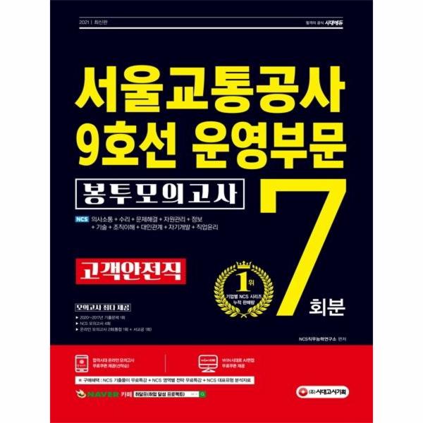 서울교통공사 필기시험 합격을 위해 (주시대고시기획에서는 2021년 채용을 대비하여 서울교통공사 맞춤형 문제로 구성한 『2021 최신판 서울교통공사 9호선 운영부문 고객안전직 NCS 봉투모의고사 7회분』을 출간하였다. 상세한 해설로 혼자서도 학습이 가능하도록 하였으며, 온라인 모의고사를 무료로 응시할 수 있는 쿠폰을 제공하여 서울교통공사 NCS 문제 유형 연습과 함께 자신의 실력을 최종 점검할 수 있도록 하였다.