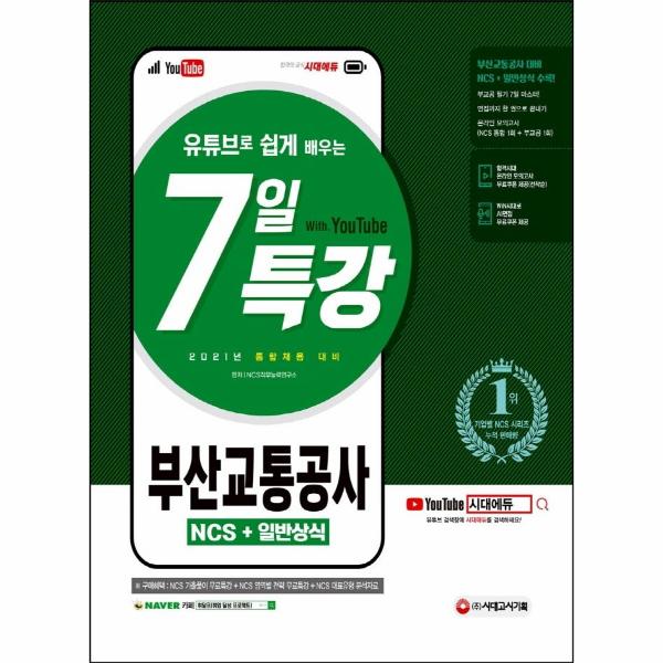 부산교통공사 필기시험 합격을 위해 (주시대고시기획에서는 2021년 채용을 대비하여 부산교통공사 맞춤형 문제로 구성한 『2021 최신판 유튜브로 쉽게 배우는 부산교통공사 NCS+일반상식 7일 특강』을 출간하였다. 상세한 해설로 혼자서도 학습이 가능하도록 하였으며, NCS 통합 및 부산교통공사 온라인 모의고사를 무료로 응시할 수 있는 쿠폰을 제공하여 부산교통공사 필기 유형에 대한 연습과 함께 자신의 실력을 최종 점검할 수 있도록 하였다.
