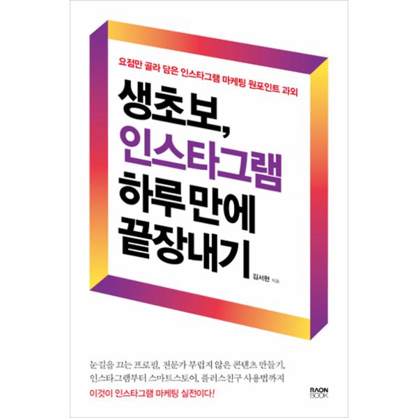 농산물 판매로 처음 SNS 마케팅을 시작한 김서현 저자는 자신의 성공 사례를 기반으로 많은 중소상공인을 코칭해왔다. 이 책은 저자의 이러한 경험을 바탕으로 실전 노하우만을 담아내, 인스타그램을 해본 적 없는 초보라도 인스타그램 마케팅을 쉽게 시도해볼 수 있도록 알려준다.
