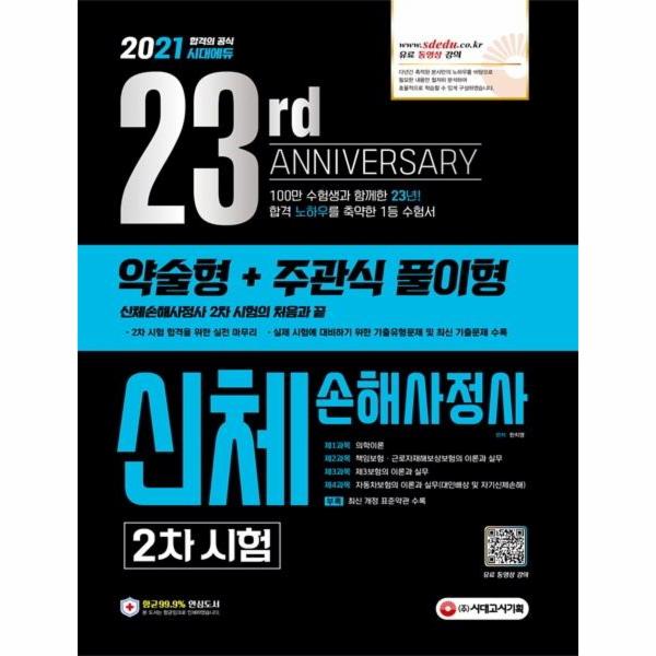 2021 시대에듀 신체손해사정사 2차 시험 도서는 2차 약술형+주관식 풀이형 문제에 대비할 수 있도록 구성된 도서입니다. 과목별로 기출을 중심으로 한 개념설명과 기출유형문제 및 모범답안을 수록하여 답안작성에 어려움이 있는 약술형+주관식 풀이형 문제의 답안 작성 방식을 알 수 있도록 하였으며, 최근 7년간의 기출문제 수록하여 출제 경향을 파악할 수 있도록 구성하였습니다. 최신 개정된 표준약관을 별책으로 수록하여 학습에 편의성을 높여 주었습니다. 시대고시기획의 손해사정사 시리즈를 통해 합격의 기쁨을 누리시길 바랍니다.