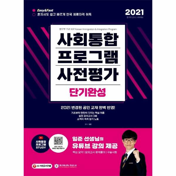 『사회통합프로그램 사전평가 단기완성』은 한국 체류자격을 얻고자 사전평가를 준비하는 모든 분들을 위하여 기획되었습니다. 2021년 변경된 공인교재 내용을 완벽하게 반영하여 사전평가에 꼭 나오는 핵심이론을 수록하였습니다. 한국어와 한국사회에 익숙한 수험자들은 물론, 한국어 공부를 시작한 지 얼마 되지 않았거나 한국사회와 한국문화가 낯선 초보 수험자도 쉽고 빠르게 높은 점수를 받을 수 있도록 구성하였습니다.
