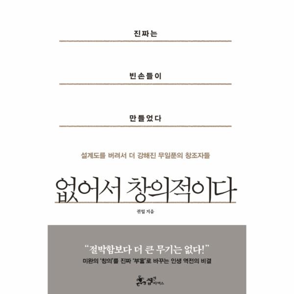 ≪없어서 창의적이다≫에는 바로 이들, 무일푼의 상황에서 누구보다 빨리, 창의적으로 ‘진짜’를 만들어낸 사람들의 이야기가 담겨 있다. “열정 없는 창의 없다.”고 강조하는 대한민국 최고의 혁신 마스터 권업 대구 테크노파크 원장은, 이 책에서 오늘날 혁신기업들에게 필요한 것은 ‘창의성’보다 그것을 실현시킬 수 있는 ‘근성’