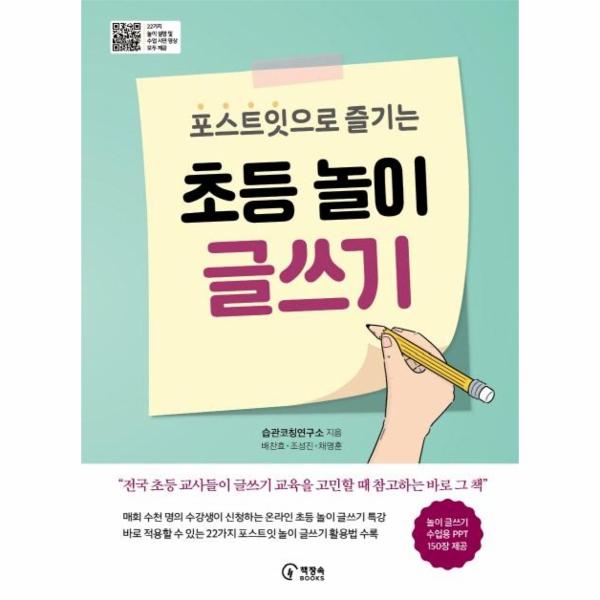 습관코칭연구소의 [온라인 초등 놀이 글쓰기] 강의를 보면, 수강한 모든 아이들이 글쓰기 재미에 푹 빠져 있다. 매회 개설과 동시에 몰려드는 수천 명의 수강생과 그들의 후기가 그것을 입증한다. 수강한 학생들과 학부모님, 그리고 선생님들은 모두 작은 포스트잇 한 장이 만들어 낸 성취감과 글쓰기 자신감에 놀란다. <포스트잇으로 즐기는 초등 놀이 글쓰기>는 그 노하우를 낱낱이 보여준다. 이 책은 아이가 글쓰기를 놀이로 즐겼을 뿐인데, 어느새 글을 잘 쓰게 되는 마법 같은 감동을 선사할 것이다.
