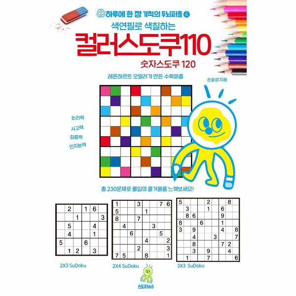 컬러 스도쿠는 고도의 시각 집중력과 논리사고력을 발달시켜 주며 기존 스도쿠에 만족하지 못하는 스도쿠 마니아들의 기대를 충족시켜 주는 최고의 퍼즐입니다. 문제를 풀어가는 능력과 귀납법, 연역법을 활용하는 논리사고력, 집중력, 창조력, 집중력을 키워주는 컬러 스도쿠와 숫자 스도쿠를 통해, 건강을 위해 매일 몸을 단련하는 것처럼 이제 두뇌 훈련 트레이닝을 해보세요!