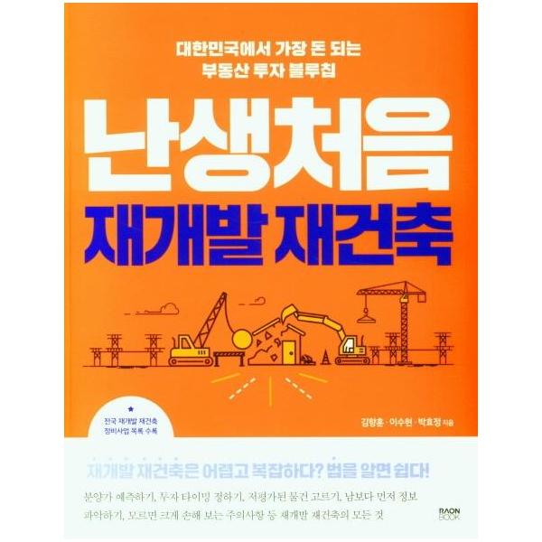 《난생처음 재개발 재건축》은 재개발 재건축 전문 변호사, 공인중개사, 감정평가사 함께 모여 초보자들이 꼭 알아야 하는 재개발 재건축 사업의 모든 것을 담았다. 간단한 용어 설명부터 조합원의 문제점 발견하기, 사업 단계별 놓치지 말아야 할 포인트, 감정평가액 잘 받는 법, 부동산 중개업소 활용법 등까지 전문가의 안내대로 하면 ‘똘똘한 한 채’를 가질 수 있도록 한다.
