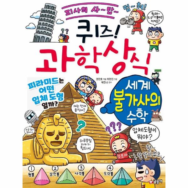 《퀴즈! 과학상식-세계 불가사의 수학》에서는 신기하고도 놀라운 불가사의한 현상들과 미스터리한 사건들에 숨겨진 수학 이야기를 만날 수 있어요. 평면도형, 입체도형, 확률, 각도, 수의 규칙, 암호, 분수, 수의 연산 등 다양한 수학 영역을 공부하며 신비롭고 알쏭달쏭한 불가사의에 관한 비밀을 함께 풀어갈 수 있답니다