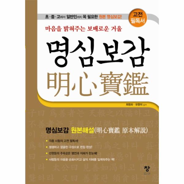 명심보감은 고려 충렬왕 때 예문관 제학을 지낸 추적이 중국 고전에서 성현(聖賢들의 주옥같은 금언(金言과 명구(名句를 모아 만든 인격 수신서(修身書이다. 주로 한문을 배우기 시작할 때 천자문을 익힌 다음 동몽선습과 함께 기초 과정 교재로 쓰였으며, 일찍이 선조들이 널리 애독하고 소중히 여겼던 도덕 교과서로서 우리 민족의 정신적 가치관 형성에 일익을 담당해 왔다. 내용은 본래 계선편ㆍ천명편 등 모두 20편으로 되어 있었으나 후일에 와서 증보편ㆍ효행편(속ㆍ염의편ㆍ권학편을 팔반가를 보강한 내용을 모두 수록하였다. 비록 한문 고전에서 단편적인 교훈을 모아 놓은 것이지만 그 생명과 가치는 오늘날에도 생생하게 빛나고 있으므로 ‘마음을 밝게 하는 거울’임에 틀림이 없다. 따라서 모든 사람들이 항상 좌우명(座右銘으로 삼고 본받아야 할 가르침의 말들을 이 책을 통해 많은 사람들이 선한 본성을 되찾고 인격을 도야하여 지성인이 될 것을 바라는 바이다.