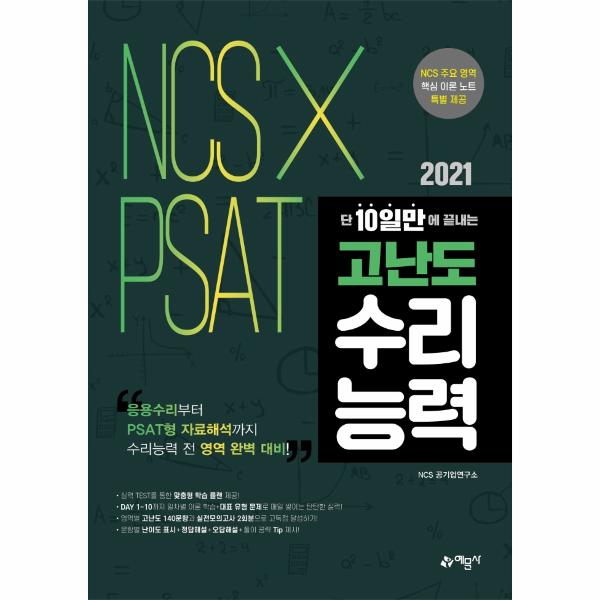 최신 NCS 출제 경향을 완벽하게 반영한 ‘2021 단 10일만에 끝내는 NCS×PSAT 고난도 수리능력’ 도서가 출간되었습니다. 응용수리부터 PSAT 자료해석까지 수리능력의 전 영역을 맞춤형 학습 플랜으로 단 10일만에 끝낼 수 있는 최고의 수험서로서, 수험생들이 시험에 빠르고 쉽게 합격할 수 있도록 하였습니다.