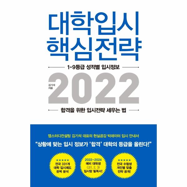 시중에 나와 있는 입시안내서는 크게 두 종류로 나눠볼 수 있다. 하나는 대학교 입학처 홈페이지에 공개된 단순 데이터들을 나열한 두꺼운 책이다. 담겨 있는 정보는 방대하지만 그 정보들을 활용하는 방법에 대한 안내가 부족해 수험생 개개인의 맞춤형 입시전략을 세우는 데는 큰 도움이 되지 않는다는 문제가 있다. 다른 하나는 상위권 학생들에게만 해당하는 입시전략만 담고 있는 입시안내서이다. 대한민국 수험생 대부분이 평균의 중하위권이라는 것과 상위권 입시가 중하위권 입시와 다르다는 것을 감안하면 많은 학생에게 맞지 않는 정보이다. 이런 안타까운 현실 속에서 맵스터디컨설팅의 김기한 대표는 ‘1~9등급 모두를 위한 진짜 입시정보와 전략’을 찾기 위한 연구를 지속해왔고, 이 책 『대학입시 핵심전략 2022』를 펴내게 되었다.