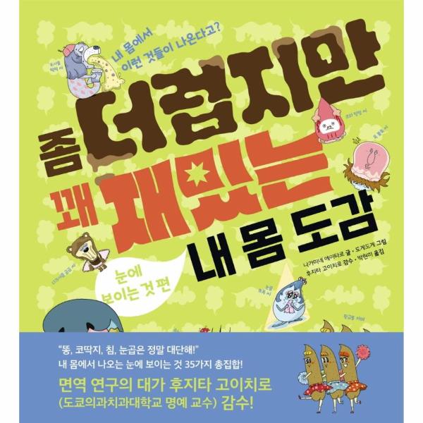 《좀 더럽지만 꽤 재밌는 내 몸 도감: 눈에 보이는 것 편》은 우리 몸에서 나오는 것들이 왜 나오는지, 어떻게 만들어지는지를 충실하게 설명하며 우리 몸을 어떻게 관리해야 하는지까지 알려 주는 ‘우리 몸 백과사전’입니다. 이 책은 몸에서 나오는 것 35가지에 대한 오해를 풀면서, 이것들이 몸의 건강에 얼마나 중요한지 보여 줍니다. 우리 몸에서 나오는 것들을 재미있고 익살맞게 캐릭터로 표현하여 한층 더 친근감을 느끼게 했지요. 거기에 면역 연구의 대가인 후지타 고이치로 도쿄의과치과대학교 명예 교수의 감수를 받아 전문성을 더했습니다.