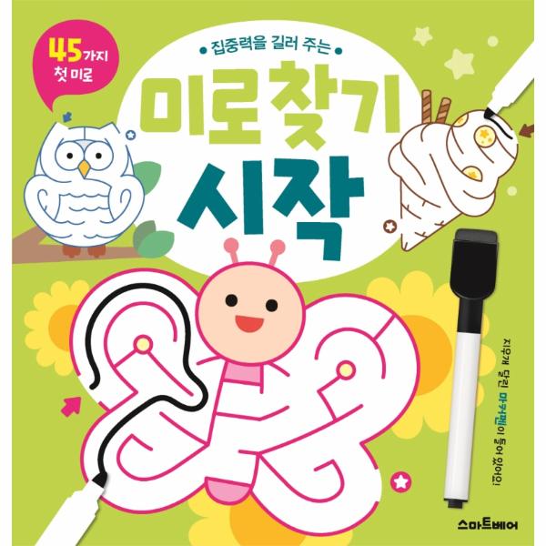 <미로 찾기 시작>은 미로 찾기를 처음 대하여 서툰 아이들도 쉽게 시작할 수 있도록 단계별로 구성된 책이에요. 한눈에 출구를 찾을 수 있는 쉬운 미로부터 판단력이 필요한 복잡한 미로까지 45가지 미로를 모두 풀어 보세요. 선을 그렸다 지웠다 반복하며 미로 찾기를 연습하면 운필력, 눈과 손의 협응력이 더욱 정교해집니다.