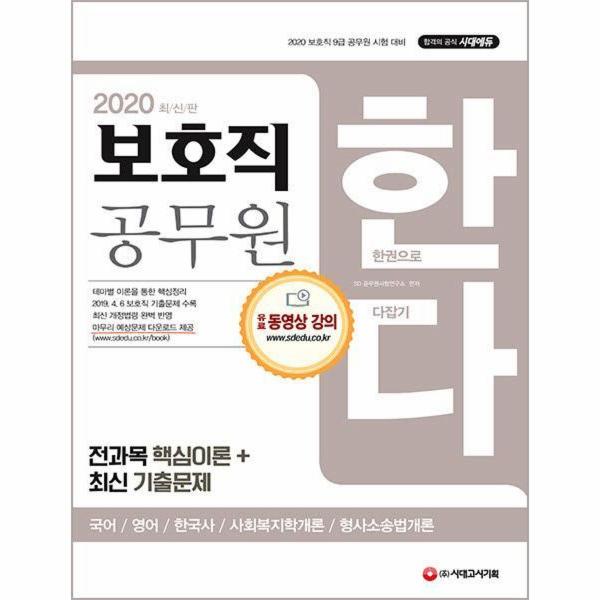 「2020 보호직 공무원 한다(국어, 영어, 한국사, 사회복지학개론, 형사소송법개론」는 9급 보호직 채용시험에 대비하기 위한 교재로, 보호직 시험의 공통과목인 국어, 영어, 한국사와 대다수의 수험생들이 선택하는 선택과목인 사회복지학개론과 형사소송법개론을 짧은 기간에 반복 숙달할 수 있도록 구성된 이론서입니다. 각 과목마다 그 과목의 특징이 있으며, 이에 맞춘 수험전략이 필요하기 때문에 각 과목마다 최적화된 방식으로 구성하였습니다.
