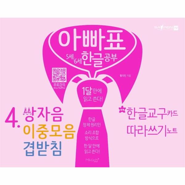부록으로 제공하는 ‘양각 한글 교구 카드’로 놀이를 통해 한글 원리를 익힐 수 있습니다. 또한, 연필을 쥘 힘이 없는 4세 유아도 손가락으로 따라 쓸 수 있습니다. 본문의 글씨는 다른 책보다 1.5~4배 큰 글씨로 넣었습니다. 아직 선 긋는 것이 익숙하지 않은 4세/5세 아이들도 쉽게 따라 쓸 수 있습니다.본 책 4권에는 한글 원리가 적용된 ‘가나다송’이 한 곡씩 총 4곡이 수록되어 있습니다. 이 곡들의 반주 파일과 노래를 배우는 영상을 통해 한글을 쉽게 익힐 수 있습니다. (1권: 앗싸 자음 / 2권: 얼쑤 모음 / 3권: 받침은 좋다 / 4권: 변신 로봇 쌍자음