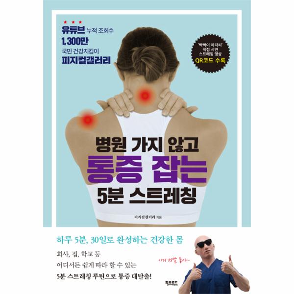 ‘유튜브 누적 조회수 1,300만!’ 체형교정 전문 채널 피지컬갤러리가 너무나 재미있고 또 유익하기까지 한 셀프 스트레칭법을 한 권의 책으로 엮어냈다. 피지컬갤러리는 이스라엘의 머슬앤모션, 호주의 물리치료사 등과 제휴하여 정말 우리 몸에 좋은 ‘검증된 스트레칭’만을 유튜브를 통해 소개하고 있다. 또한 유튜브 채널의 구독자들과 소통하여 실제로 통증으로 고생하는 사람들의 이야기를 듣고 그들에게 필요한 스트레칭법을 하나씩 하나씩 전달해 왔다. 《병원 가지 않고 통증 잡는 5분 스트레칭》은 그러한 피지컬갤러리의 셀프 스트레칭법을 목, 등, 허리, 어깨, 턱, 그리고 손목과 팔꿈치 등 신체 각 부위별로 모아 자신이 통증을 느끼는 부위를 빠르게 찾아볼 수 있도록 구성하였다.