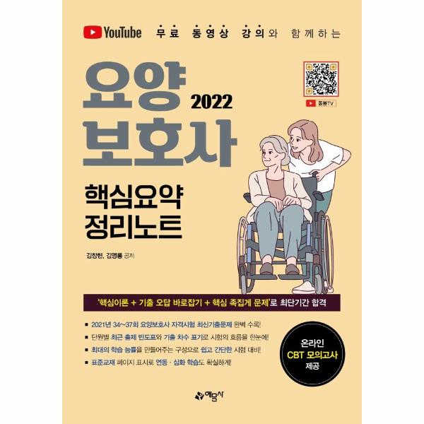 최신기출을 완벽하게 반영한 ‘2022 유튜브 무료 동영상 강의와 함께하는 요양보호사 핵심요약정리노트’ 도서는 이론부터 문제까지 한 권에 구성하여 요양보호사 자격시험의 단기 합격을 보장합니다. 또한 관련 내용이 나오는 표준교재 페이지와 기출 차수를 표기하여 효율적인 학습이 가능하도록 하였습니다.