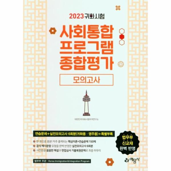 대한민국 국적 취득 사회통합프로그램 종합평가 합격을 위한 ‘2023 귀화시험 사회통합프로그램 종합평가 모의고사’가 출간되었습니다. 본 도서는 최근 개정된 법무부 신교재와 공식 예시문항의 유형과 난이도를 확실하게 반영하였습니다. 새롭게 바뀐 유형을 바탕으로 출제한 모의고사와 깊이 있는 해설로 단번에 합격할 수 있도록 도와드립니다.