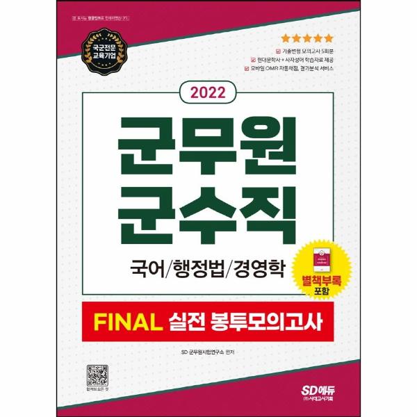 이에 SD에듀와 군무원 전문 교수진이 함께 손잡고 군무원 전문 도서 시리즈를 기획하게 되었습니다. 『군무원 FINAL 실전 봉투모의고사』는 그 기획의 일환으로서, 실제 시험과 동일한 유형의 기출변형 모의고사를 통해 학습자들이 학습의 최종마무리를 하고, 실전 감각을 키울 수 있도록 구성하였습니다. 또한, 가장 대중적인 행정직, 군수직에서부터 기계직, 전산직, 전기직과 같은 직렬까지 총망라하였습니다.