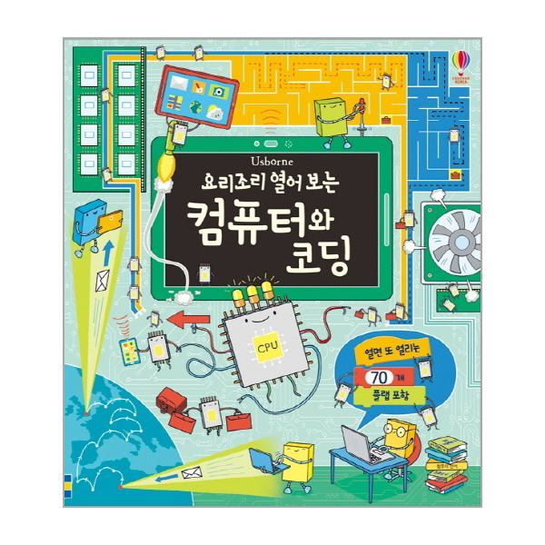 컴퓨터가 어떤 일을 하는지부터 컴퓨터 안에는 무엇이 들어 있는지, 컴퓨터가 어떻게 작동하는지 등 컴퓨터의 구성과 작동 원리에 대해 찬찬히 알려 줘요. 컴퓨터가 명령어를 통해 일한다는 것을 이해시켜 준 다음에는 명령어를 작성하는 ‘코딩’에 대한 정보를 전해 주지요. 코딩이 무엇인지 개념을 풀어 가는 과정에서 초보자용 프로그래밍 언어인 ‘스크래치’로 직접 프로그래밍 하는 방법을 보여 줘요. 또한 ‘인터넷에는 어떻게 연결돼요?’, ‘컴퓨터는 언제 처음 나왔어요?’ 등 아이들이 궁금해 할 법한 질문들이 주제별로 담겨 아이들의 지적 호기심을 자극하지요. 데스크톱 컴퓨터, 노트북, 스마트폰, 태블릿 등을 재현한 플랩은 다양한 컴퓨터의 종류와 각기 다른 일하는 방식을 시각화하여 쉽게 전달해 줘요. 플랩 속 플랩을 열면 복잡한 컴퓨터 속 구석구석을 그대로 들여다볼 수 있고요. 컴퓨터가 어떤 부품들로 이루어졌는지 입체적으로 확인하고, 각 부품들의 명칭과 하는 일을 익힐 수 있답니다.