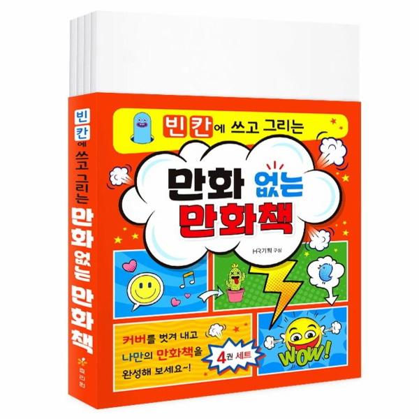 『만화 없는 만화책』(4권 세트는 커버를 벗겨 내고 표지를 마음대로 꾸밀 수 있습니다. 아무 그림도 없는 흰색 면에 제목을 써 넣고 그림을 그려 나만의 만화책을 완성해 보세요.
