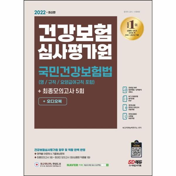 건강보험심사평가원 합격을 위해 SD에듀에서는 채용을 대비하여 건강보험심사평가원 맞춤형 문제로 구성한 『2022 최신판 건강보험심사평가원 국민건강보험법(영/규칙/요양급여규칙 포함+모의고사5회+오디오북』을 출간하였다. 상세한 해설로 혼자서도 학습이 가능하도록 하였으며, 건강보험심사평가원 온라인 모의고사를 무료로 응시할 수 있는 쿠폰을 발급하여 건강보험심사평가원 문제 유형에 대한 연습과 함께 자신의 실력을 최종 점검할 수 있도록 하였다.