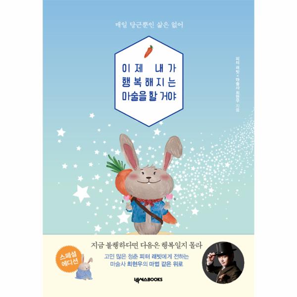 24개 언어로 출간되어 전 세계적으로 가장 유명한 토끼 피터 래빗. 《이제 내가 행복해지는 마술을 할 거야》에서는 고민 많은 청춘을 대변하는 프로 걱정꾼으로 재탄생한 피터 래빗(일명 멍토끼라 불림과 소심한 모범생에서 초긍정 마술사가 된 최현우가 만나 스물다섯 가지 고민을 나눈다. 최현우 마술사와 피터 래빗이 시행착오를 겪고 서로 다독여 주기도 하면서 마음 안의 고민을 털어버리고, 그동안 보지 못했던 삶의 방향을 찾는다.