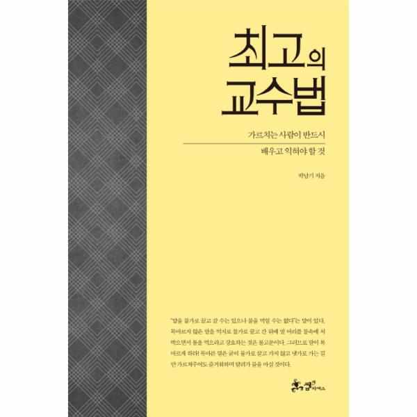 저자는 책 속에서 ‘최고의 교수법’을 “어떤 특정 기법이 아니라 가르침의 본질에 대한 끝없는 성찰과 자신에게 적합한 교수법을 찾아 쉼 없이 노력하는 자세, 그리고 열정 그 자체’라고 정의한다. 이러한 정의에 따라 이 책은 단순히 좋은 기법과 나쁜 기법, 최신 기법과 낡은 기법에 대해 말하기보다는 가르침의 본질에 더 가깝게 다가가려는 저자의 끈질긴 노력과 성찰의 흔적을 담고 있다.
