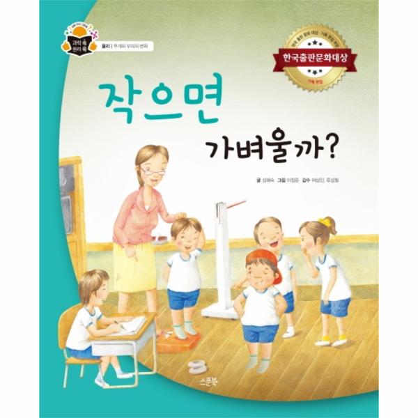 달에 가면 정말로 몸무게가 줄어드나요? 물속에 들어가면 왜 몸이 둥둥 뜰까요? 부피가 작을수록 가벼울까요? 아이들이 만나는 일상 속엔 이렇듯 알쏭달쏭한 질문이 끊임없이 샘솟지요.《작으면 가벼울까?》는 평소 몸무게 때문에 스트레스를 받는 혁이가 일상생활에서 때때로 몸무게가 왜 다르게 느껴지는지, 부피의 크기에 따라 무게가 어떻게 달라지는지 등에 의문을 품고 각각의 현상들 속에 숨겨진 과학 원리를 하나씩 깨우쳐 가는 과정을 담은 과학 지식 그림책이에요.