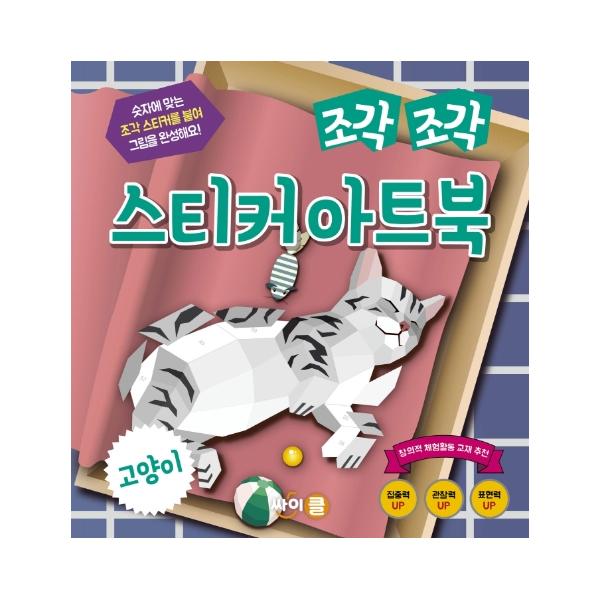 『조각 조각 스티커 아트북』은 스티커를 붙여 그림을 완성할 수 있는 숫자 도안이 담긴 바탕지 8장과 바탕지 숫자에 맞는 알록달록 조각 스티커 10장으로 구성되어 있어요. 『조각 조각 스티커 아트북』 시리즈 ‘고양이’ 편에서는 이그조틱, 아메리칸 쇼트헤어, 샴, 뱅갈, 노르웨이 숲, 스코티시 폴드, 코리안 쇼트헤어, 러시안 블루 등 총 8마리의 고양이를 완성할 수 있어요. 조각 스티커의 개수는 51개부터 76개까지 작품마다 다양하게 구성되어 있어서 붙이기 쉬운 그림부터 완성도 높은 그림까지 체험해볼 수 있어요.