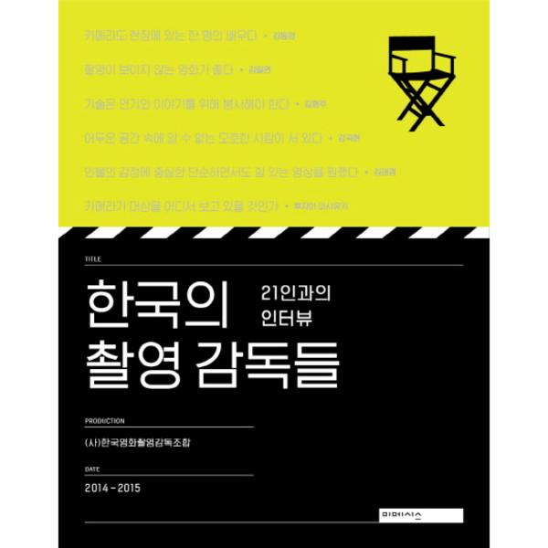『한국의 촬영 감독들: 21인과의 인터뷰』는 한국 영화 촬영을 대표하는 21인의 촬영 감독과 28편의 영화에 대해 상세히 나눈 이야기를 정리한 책이다. (사한국영화촬영감독조합에서 2014~2015년 개봉작 중 촬영이 우수한 영화를 선별해 그 촬영 감독을 만나 주고받은 문답이다. 영화 제작의 전반적인 이해는 물론 영화 촬영의 개념, 여러 현장 경험...