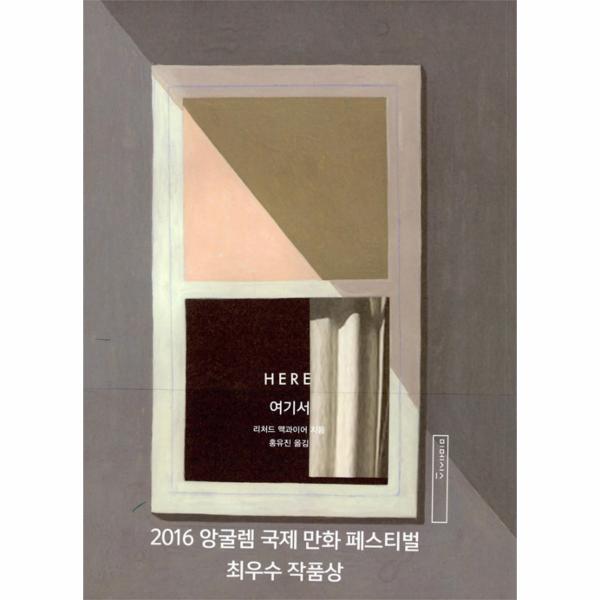 표지를 열면, 거기에 방이 하나 있다. 창문과 벽난로 외에는 아무것도 없는 방이다. <여기>는 어디일까? 첫 페이지를 펼치자, 앞과 같은 방 안에 소파만 덩그러니 놓여 있고 왼쪽 위에는 <2014>라는 숫자가 표시되어 있다. 다음 페이지에도 <2014>. 다만, 소파는 흔적을 감추고 벽에는 새로운 책장과 이제 막 꽂힌 듯한 책들, 그 근처에는 책을 담아 두었던 종이 박스가 열려 있다. 누군가가 이제 막 이사를 왔는지도 모른다. 그런데 다음 페이지를 열면, 방은 그대로이지만 시간은 반세기 이전인 <1957>년을 가리킨다. 살림살이와 벽지는 2014년에는 없었던 것들이다. 방 한가운데에 놓인 아기 침대와 소파 위의 분유통이 한 아이의 탄생을 알린다. 다음 페이지로 넘어 가니 이번엔 <1942>년이다. 벽지가 다르다. 창문이 열린 방 안에는 사다리 하나뿐. 그다음 페이지인 <2007>년에는 펼쳐 놓은 소파베드가 보이고, 열어 둔 창문으로 <여기>에 바람이 들어오고 있다. 계속해서 다음 페이지를 보면, 다시 <1957>년으로 돌아온다. 드디어 사람이 등장해서 이 방 안에 왜 들어왔는지 생각나지 않는다며 첫 대사를 한다. 동시에 <1999>라고 표시된 작은 컷이 같은 화면의 오른쪽 페이지 아래에 보이고, 컷 안에는 고양이 한 마리가 걷고 있다. 두 개의 시대가 두 개의 창을 통해서 두 페이지에 걸쳐서 그려진 셈이다. 또 페이지를 넘기면 <1623>년이고, 400년 전인 <여기>에서는 아직 방이 존재하지 않는다. 그러나 1957년의 방 일부분과 1999년 방 한구석이 역시 시간을 넘어서 공존한다.