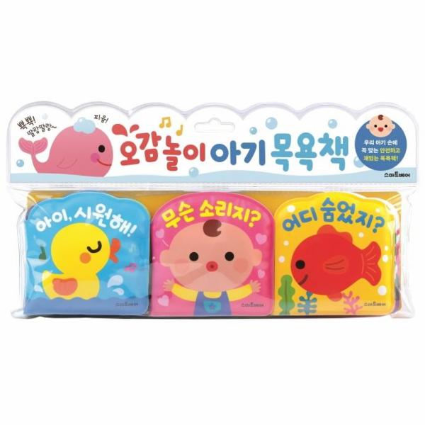 꾹꾹 누르면 피융~ 물총으로 변하는 물총놀이책, 뾱뾱 소리 나는 뽀뽀책, 흔들면 딸랑딸랑 소리 나는 방울책 3권으로 알차게 구성한 목욕책 세트입니다. 저마다 다른 기능으로 되어 있어, 하나씩 누르고 흔들며 놀다 보면 목욕 시간이 금세 지나가 버립니다. <오감놀이 아기 목욕책>과 함께 엄마도 아이도 신나게 목욕놀이를 즐겨 보세요!