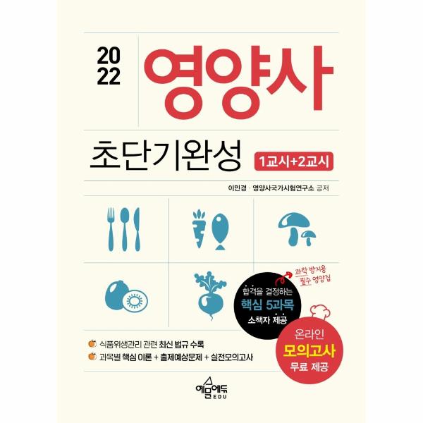 전문 연구원의 노하우와 지식을 총동원하여 집필한 ‘2022 영양사 1교시+2교시 초단기완성’ 도서가 출간되었습니다. 본 도서는 한국보건의료인국가시험원의 출제범위를 완벽 반영함은 물론, 효율적인 학습을 위해 1교시, 2교시를 분권 구성하여 수험생들의 교재 활용도를 높였습니다. 또한 빠르게 합격하기 위해 과목별 ‘과목별 핵심이론+과목 마무리 문제+실전모의고사로 구성하였고, 언제 어디서나 확인할 수 있는 ‘핵심 5과목’과 ‘온라인 모의고사’까지 제공함으로써 누구보다 빠른 합격이 가능합니다.