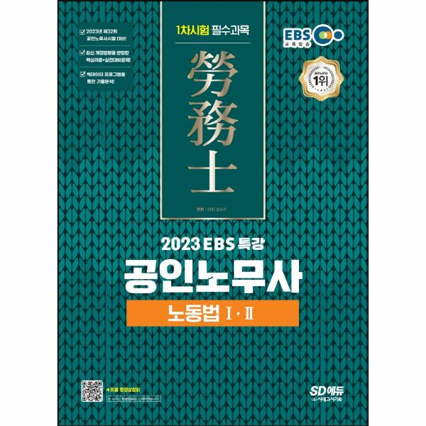 전 과목의 평균이 60점 이상이면 합격하는 1차시험 준비의 키워드는 ‘효율성’으로, 보다 어려운 2차시험 준비를 철저히 하기 위하여 단시간에 효율적으로 학습할 필요가 있습니다. 2023 EBS 특강 공인노무사 1차시험 노동법Ⅰ·Ⅱ는 이를 위한 기본서로서 다년간의 기출문제를 분석하여 꼭 필요한 내용만을 담아 구성하였습니다. 또한 최신 개정법령과 최근 기출문제의 출제경향을 완벽하게 반영하였고, 상세한 이론 및 해설을 수록하였으며, 보다 깊이 있는 학습을 원하는 수험생들을 위한 동영상강의(유료를 준비하였습니다. SD에듀의 공인노무사 시리즈와 함께 합격의 기쁨을 누리시길 바랍니다.