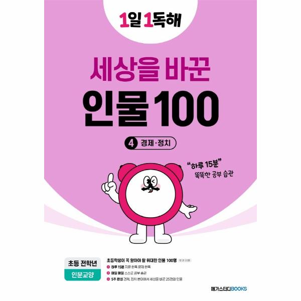초등학생이 꼭 알아야 할 인물 100명을 선정하여 예술, 과학, 봉사, 경제나 정치 등 다양한 분야의 인물들의 일생을 1쪽의 지문으로 흥미롭게 풀어 냈습니다. 독해력을 강화할 뿐만 아니라, 여러 분야의 배경지식까지 쌓을 수 있습니다.