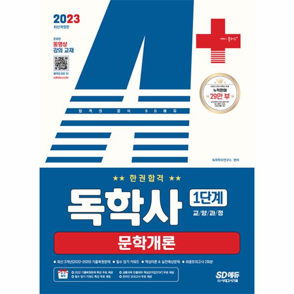 본 교재는 독학사 1단계 전용 수험서로 1단계 시험에 도전하는 수험생들이 한 번에 합격할 수 있도록 구성하였습니다. 먼저 ‘최신 기출문제’에서는 2022~2020년 기출문제를 복원하여 독학사 1단계 시험의 최신 경향을 파악할 수 있습니다. 또한, ‘핵심이론’에서는 시험에 빈출되는 중요한 내용을 ‘중요도’와 ‘기출’로 표시하였고, ‘체크포인트’와 ‘더 알아두기’를 통해 관련 있는 중요 내용을 확인할 수 있습니다. 뿐만 아니라 기출유형이 반영된 ‘실전예상문제’를 수록하여 본 교재로 공부하는 독자분들이 실력과 자신감을 기를 수 있도록 하였습니다. 부록으로 마무리 점검이 가능한 ‘최종모의고사’ 2회분을 수록하였습니다. 마지막으로 ‘시험에 합격하는 필수 암기 키워드’를 수록하였으며, 이는 휴대하여 어디서나 편리하게 학습할 수 있습니다. 온라인을 통해 ‘필수 암기 키워드’와 ‘2022년 기출문제’ 무료 강의가 제공되고 있으니 활용해보시기 바랍니다.