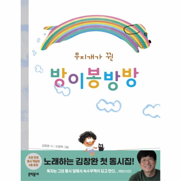 김창완은 동심을 만나기까지 오랜 시간이 걸렸다고 고백한다. “금지된 것, 벽이 된 것으로부터 벗어나고 싶었지만 실행하지 못한 부족함” 때문에 동시를 쓰게 된 것이 어느덧 200여 편. 그중 51편을 『무지개가 뀐 방이봉방방』에 먼저 실었다. 1부에는 김창완이라는 아이, 2부에는 현재의 김창완을 구성해 온 것, 3부에는 긴 호흡으로 걸어왔던 삶의 순간순간 세상을 향해 놓지 않은 질문과 답을 담았다. 세련된 그림 기법과 깊은 해석으로 독보적인 영역을 확보하고 있는 오정택 화가의 그림들 속에 숨겨진 히든트랙처럼, 김창완이 직접 그린 그림(「소 그리기」과 손글씨(「칸 만들기」도 만날 수 있다. 아이 김창완, 어른 김창완, 가수 김창완, 연기자 김창완, 시인 김창완…… 아무 김창완들이 마음이 흐르는 대로 쓴 동시를 감상하는 첫 번째 방법은 그냥 즐기기. 주석과 해석 없이 마음껏 즐기는 것. 산울림의 “우리 같이 놀아요”나 “산할아버지 구름모자 썼네”라는 노랫말이 골목을 흔들었던 8, 90년대를 기억하는 어른들, 노래보다 연기로 더 잘 알고 있을 2019년의 어린이들 모두에게 그의 첫 동시집은 ‘네 맘이 내 맘’인 단짝처럼 반갑고 시야가 탁 트이는 해방감을 맛보게 해 줄 것이다.